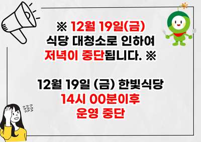 한빛식당 대청소로 인하여 12/19 저녁 운영중단 안내